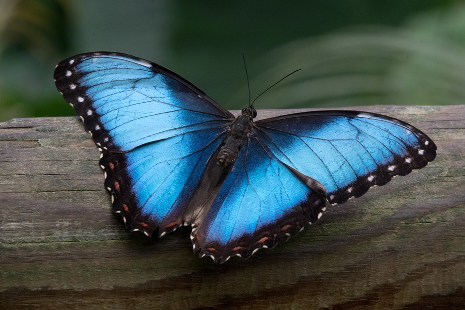 Der Himmelsfalter wird auch der blaue Morphofalter genannt. Er kann eine Flügelspannweite von 120mm erreichen. Die Vorderkanten und Außenränder der Flügel sind schwarz, die Oberseiten sind leuchtend blau, bei den Männchen ist das blau noch stärker ausgeprägt. Die Unterseiten der Flügel sind braun mit gelben Augenflecken.